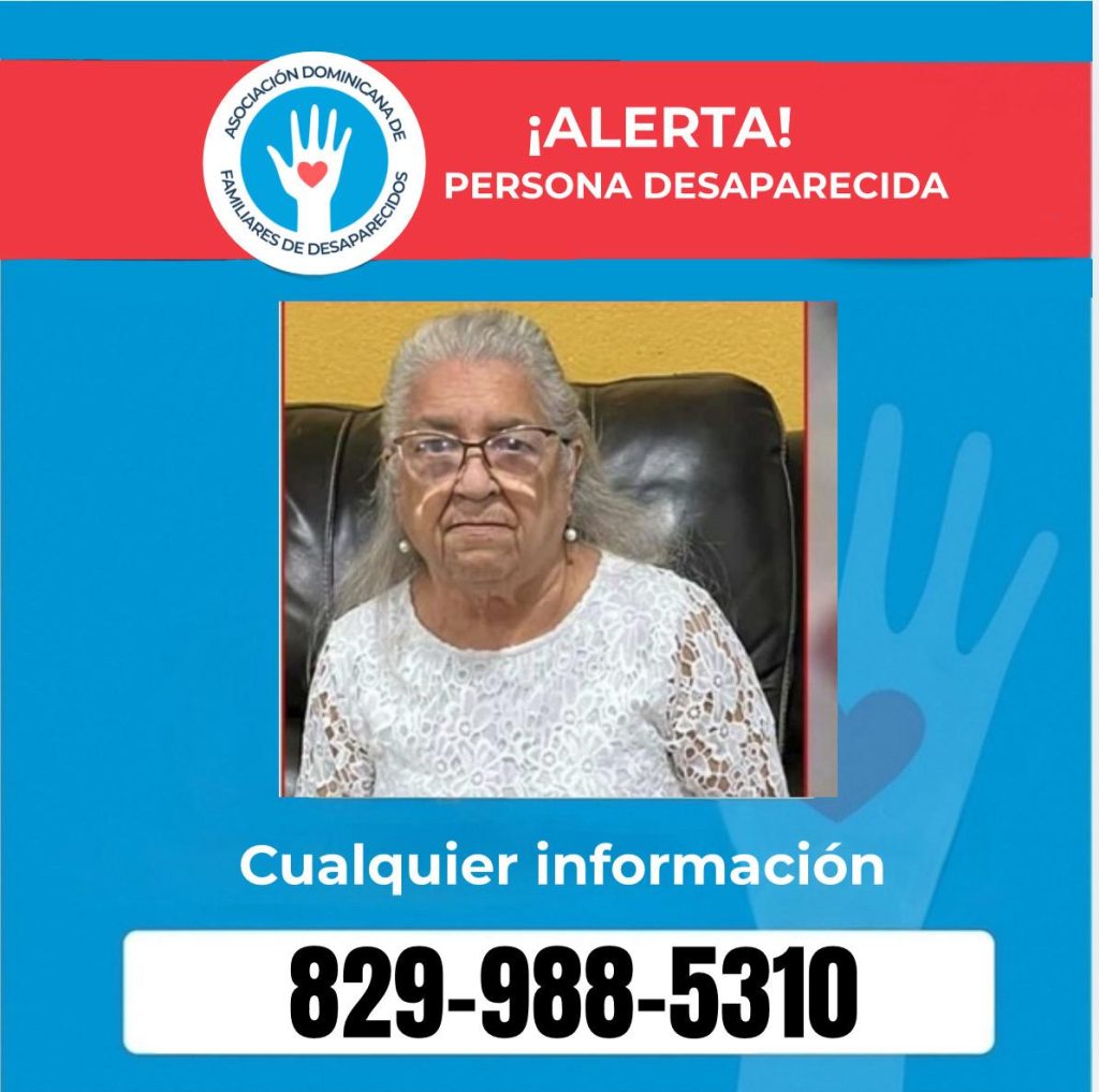 Santo Domingo.– La Asociación Dominicana de Familiares de Desaparecidos (ASODOFADE) hace un llamado urgente a la ciudadanía para colaborar en la localización de la señora Dolores Canela, de 78 años de edad, reportada como desaparecida en el municipio Santo Domingo Este.