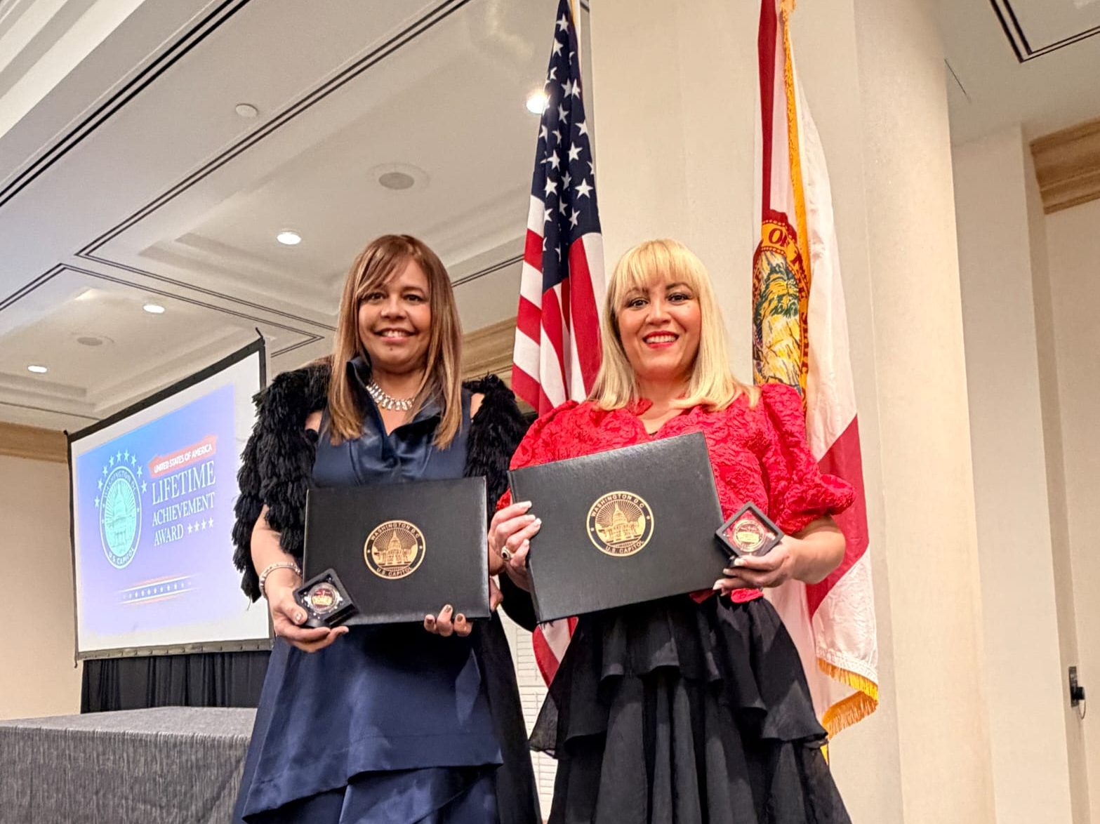 Orlando, Florida.-Las destacadas comunicadoras dominicanas Matty Frías y Gheidy de la Cruz, fueron reconocidas con la Moneda del Capitolio de los Estados Unidos durante el evento Capitol Honors Lifetime USA, una ceremonia que distingue el liderazgo, la excelencia y el servicio voluntario que fortalecen los valores y el espíritu cívico de la nación estadounidense.