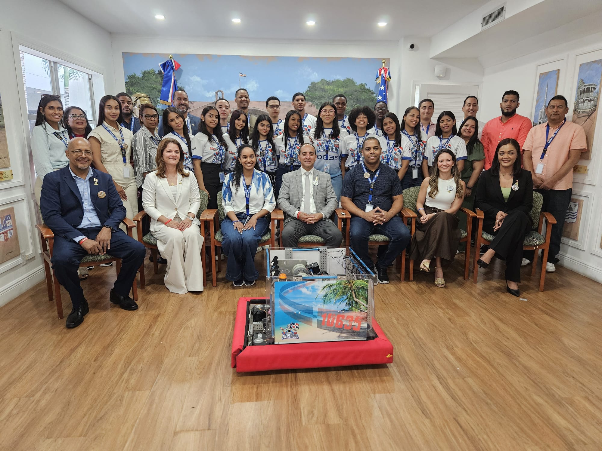 Entre tanto, dentro de las actividades relevantes, también, recibieron una amplia delegación de estudiantes del Sistema Público de Educación del país caribeño, amparados por el MINER, que año tras año participan en la competencia de Robótica en Miami, donde los estudiantes se presentaron junto a sus educadores, mostrando sus diferentes habilidades en este campo tecnológico, recibiendo innumerables muestras de cariño y un mensaje de exhortación educativa por parte del licenciado Gilberto Minaya.
