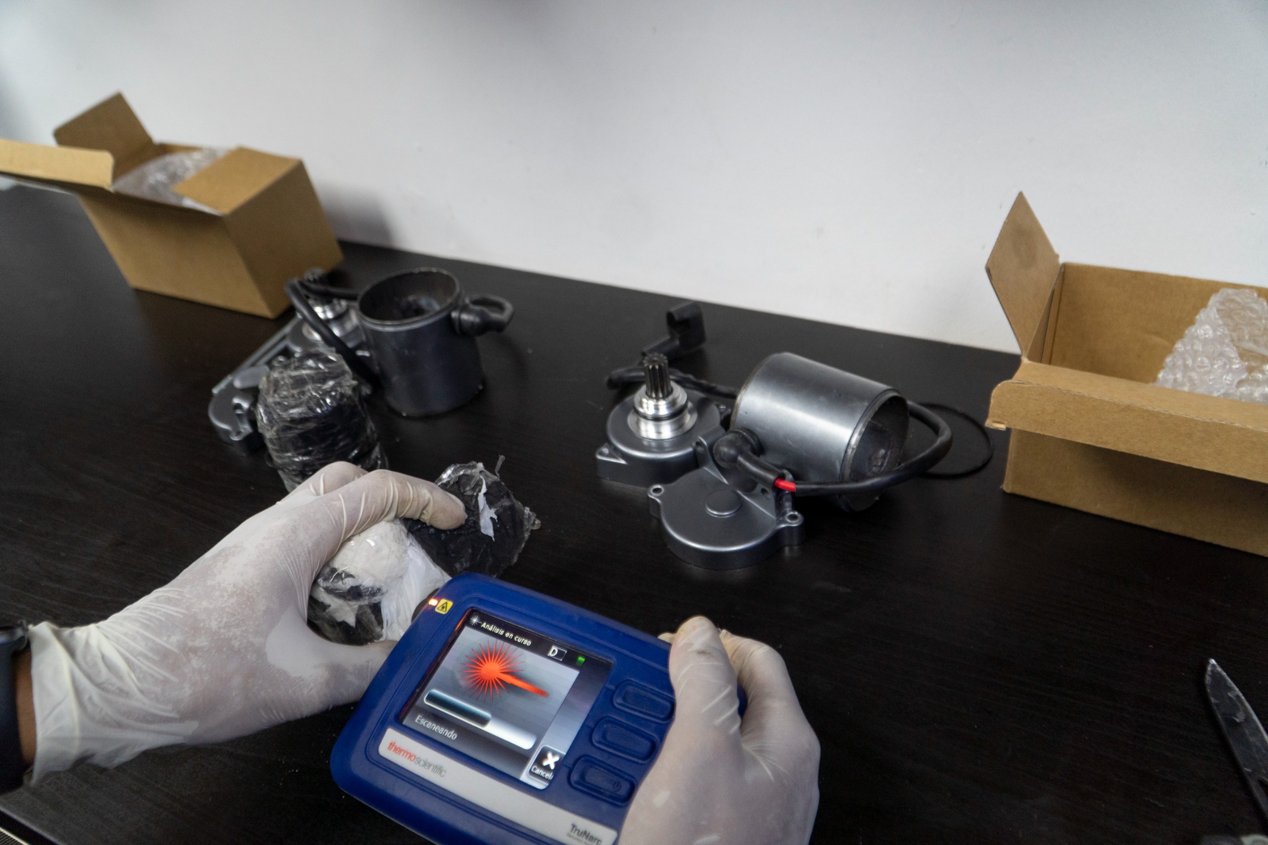 Los equipos operativos y unidades caninas se trasladaron a una empresa de envíos internacionales ubicada en el Distrito Nacional, donde localizaron una caja sospechosa. Al abrirla, descubrieron en su interior dos motores de arranque que contenían la sustancia ilícita, envuelta en fundas negras, con un peso superior a los 100 gramos.