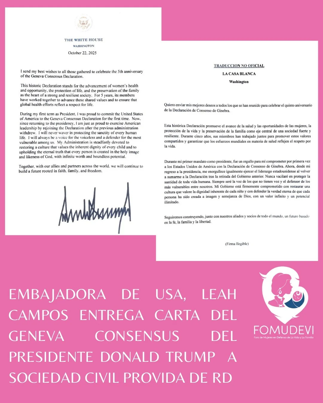 “Esperamos con entusiasmo la oportunidad de trabajar juntos para fortalecer los lazos bilaterales en defensa de la Vida, la familia, los valores, la soberanía, las libertades y, sobre todo, estaremos de pie a su lado defendiendo y protegiendo nuestros principios judeocristianos” expreso presidenta de FOMUDEVI.
