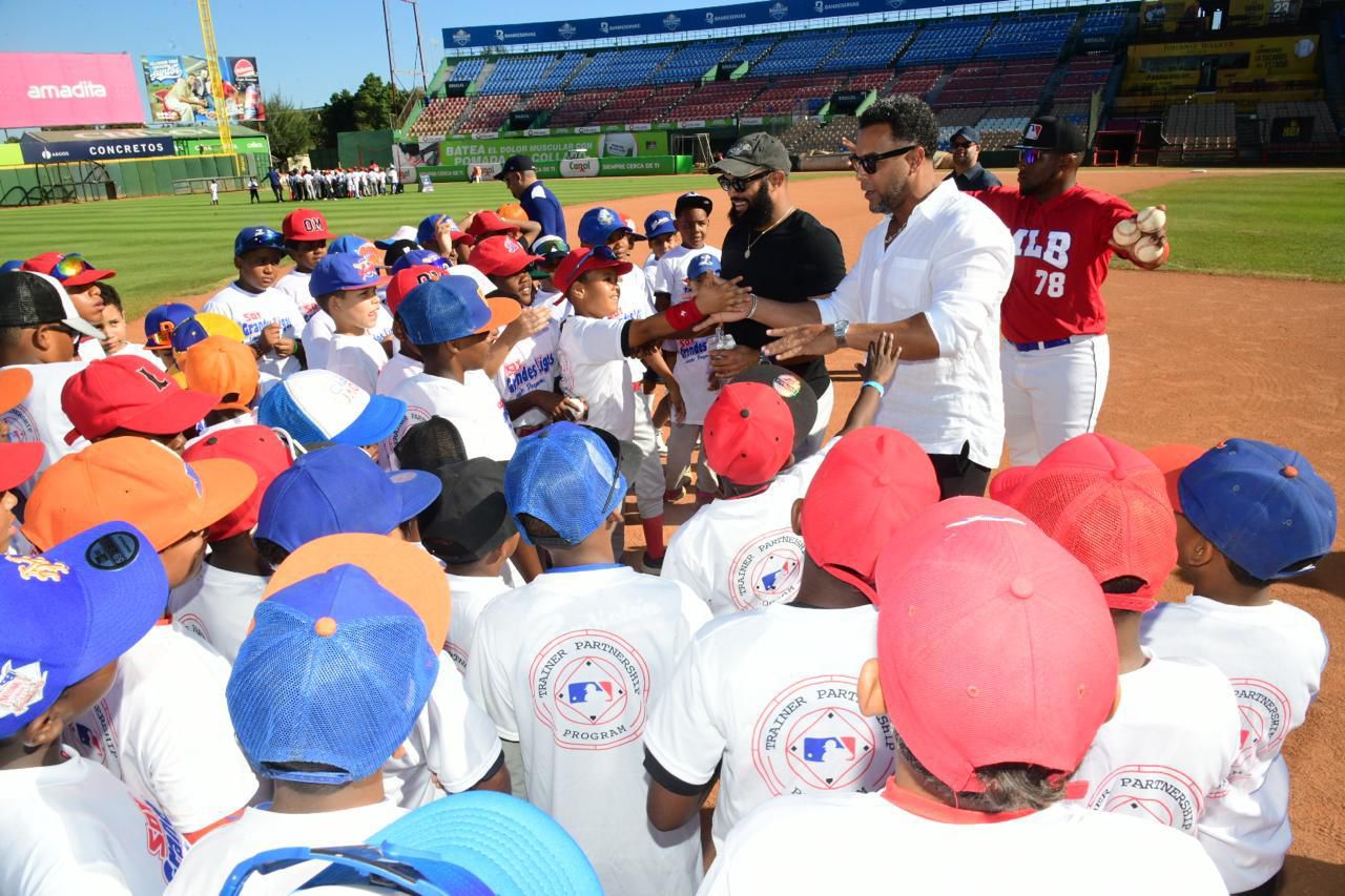 Alrededor de 300 niños participaron en la actividad, celebrada en el estadio Quisqueya Juan Marichal, donde recibieron enseñanzas técnicas y motivacionales de un destacado grupo de peloteros activos y exjugadores, en una jornada cargada de entusiasmo, aprendizaje y alegría.