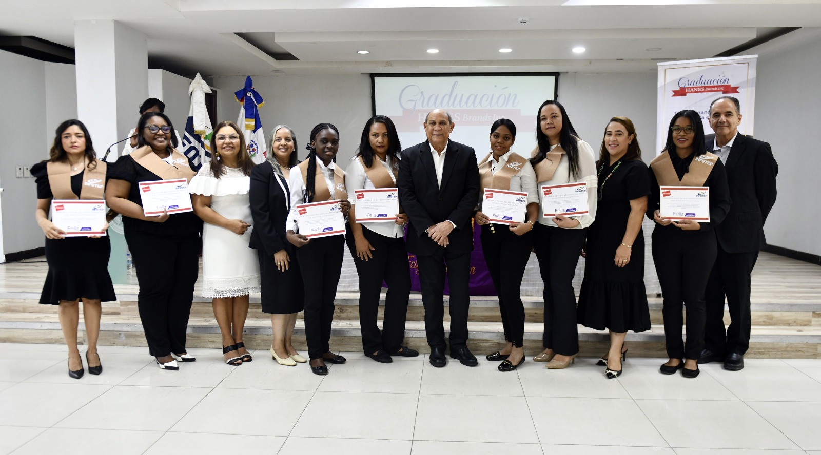 El acto de entrega de certificados estuvo encabezado por el director general del INFOTEP, Rafael Santos Badía, y el director de Operaciones de Hanes Supply Chain Holdings, Aldrin Hernández, junto a ejecutivos de ambas instituciones.