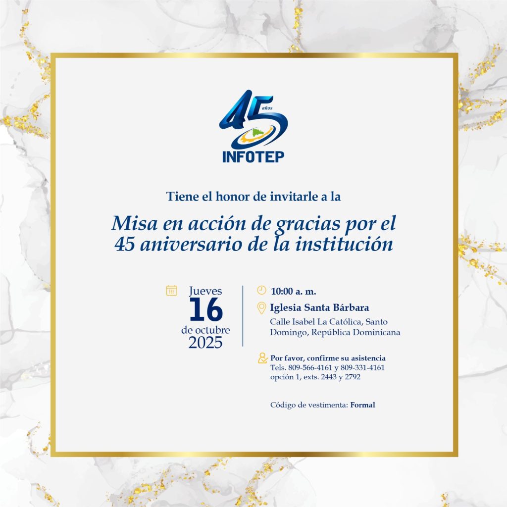 Santo Domingo.– El Instituto Nacional de Formación Técnico Profesional (INFOTEP) conmemorará su 45 aniversario con la celebración simultánea de misas en distintas regiones del país, como expresión de gratitud y unidad institucional, reafirmando su compromiso con la formación técnico profesional y el desarrollo nacional.