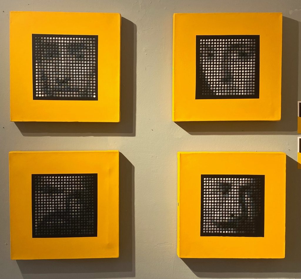 Predomina una escala acromática sustentada en valores tonales; sin embargo, en determinados conjuntos el artista incorpora colores fríos – especialmente el azul – como recurso de contraste y tensión visual. El resultado es una propuesta que oscila entre lo óptico y lo conceptual, invitando al espectador a una experiencia de observación activa.