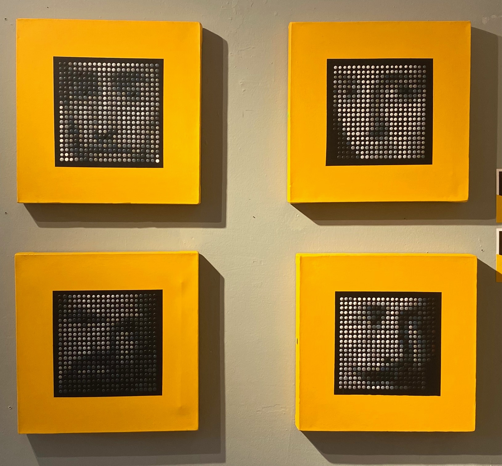 El cuerpo de obras se desarrolla mediante la repetición sistemática de puntos de acrílico organizados en estructuras seriales y medibles. Estas unidades mínimas construyen imágenes que transitan entre la abstracción y la figuración, generando profundidad y volumen sin recurrir al relieve tradicional.