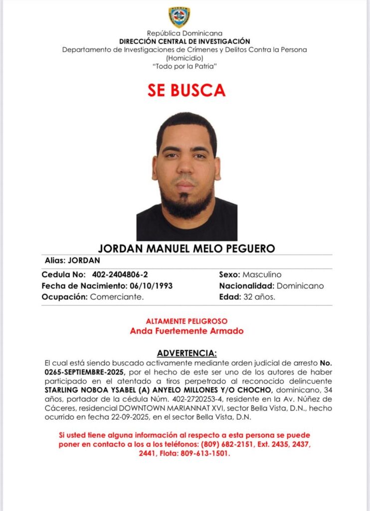 Santo Domingo.- La Policía Nacional, a través del Departamento de Investigaciones de Crímenes y Delitos Contra la Persona (Homicidios), informó que fueron identificados y se mantienen activamente buscados tres hombres señalados como presuntos autores del atentado a tiros perpetrado contra Starling Noboa Ysabel, alias “Anyelo Millones” y/o “Chocho”, hecho ocurrido el pasado 22 de septiembre en el sector Bella Vista, del Distrito Nacional.