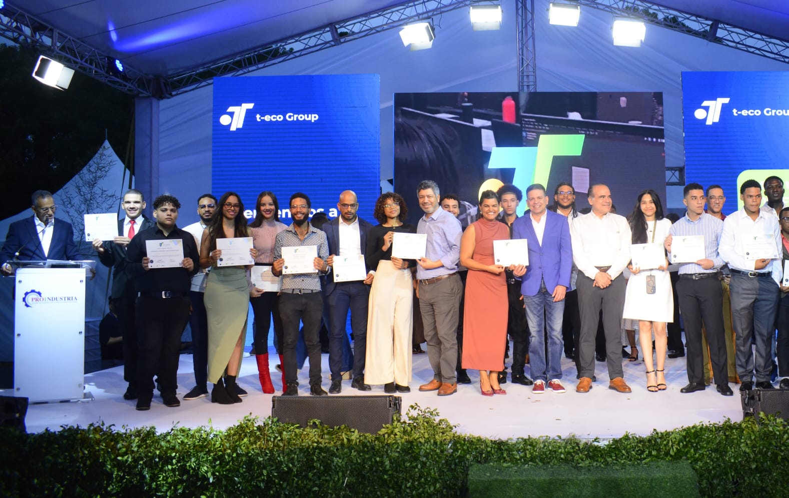 El acto de graduación reunió a autoridades y representantes del sector, entre ellos el director general de Proindustria, Rafael Cruz Rodríguez; el director de T-Eco Group, José Joaquín Sosa; el director académico Joel Peña, y la directora de Servicios de Apoyo a la Industria de Proindustria, Ilonka Acosta.