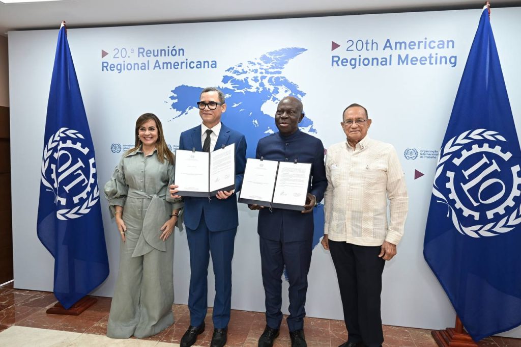 Punta Cana.- En el marco de la 20ª Reunión Regional Americana de la Organización Internacional del Trabajo (OIT), celebrada en Punta Cana, el ministro de Trabajo de la República Dominicana, Eddy Olivares, entregó en nombre del Gobierno dominicano, al director general del organismo, Gilbert Houngbo, el instrumento de ratificación del Convenio 156 de la OIT, sobre los trabajadores con responsabilidades familiares.
