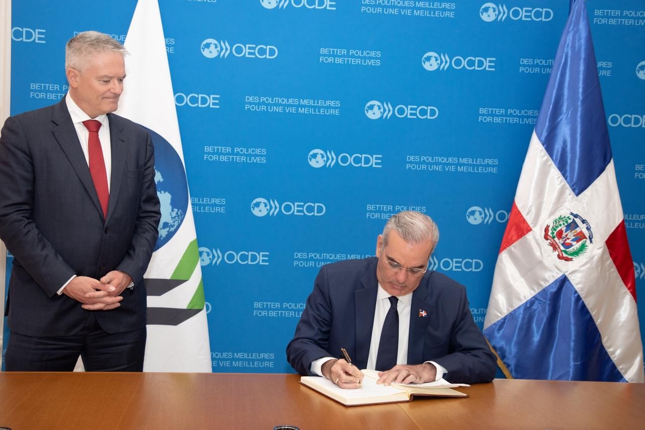 París, Francia. – En presencia del presidente Luis Abinader, el canciller Roberto Álvarez y el secretario general de la Organización para la Cooperación y el Desarrollo Económico (OCDE), Mathias Cormann, firmaron un Memorando de Entendimiento con el que las partes formalizan su acercamiento y buscan fomentar la cooperación, impulsar el intercambio de buenas prácticas, así como apoyar el fortalecimiento de políticas públicas conforme a estándares internacionales.