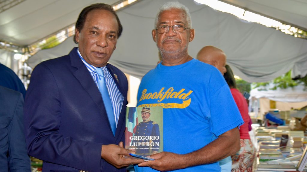 Durante su recorrido por los estantes, el general compartió con los visitantes y firmó ejemplares de su obra titulada “Gregorio Luperón, Padre de la Segunda República”.